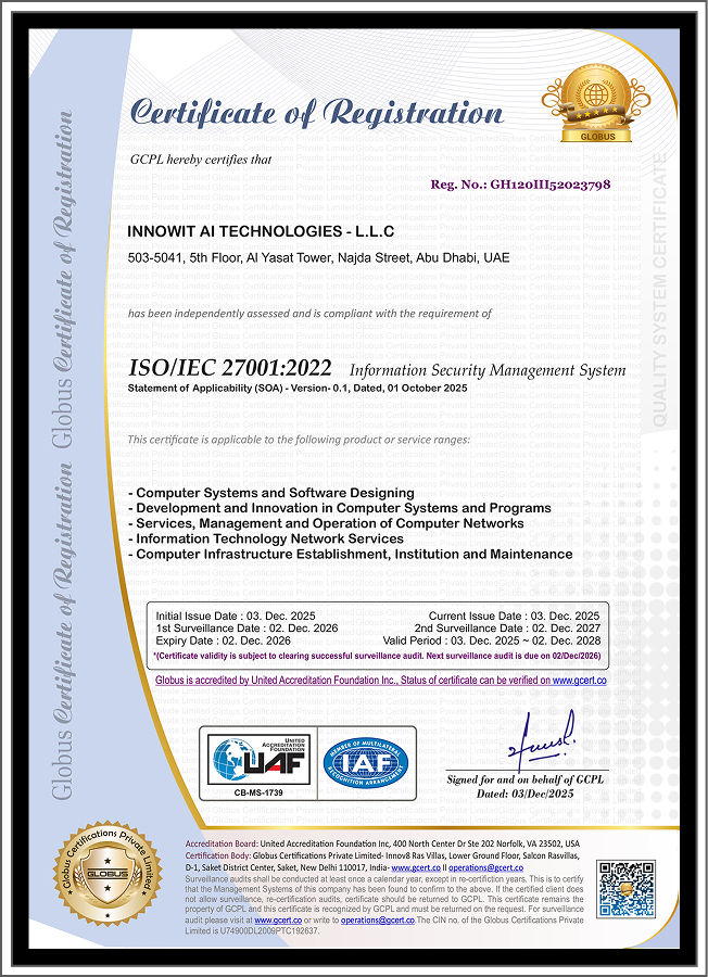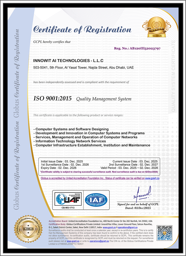 Our vision at INNOWIT AI is to lead the global technology landscape by pioneering AI driven innovations and sustainable solutions. We aim to be the preferred partner for enterprises and governments, shaping a future where technology seamlessly integrates to create value, inspire progress, and redefine industry standards.